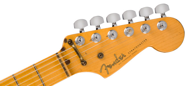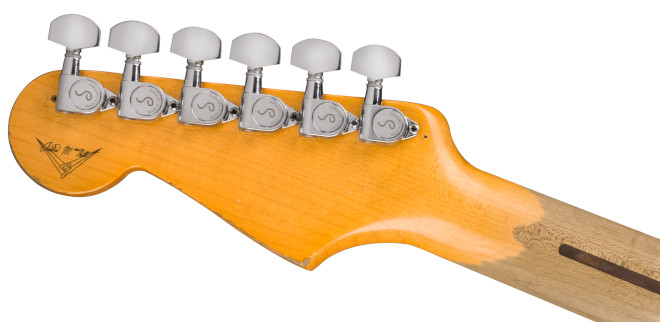 “Alligator”の最初の改造の一部であるSchaller M6チューニングペグや円筒型ストリングリテイナーを備えたヘッドストックをはじめ、ディテールへのこだわりは一目瞭然。オリジナルのギターネックをデジタルスキャンし製作した1ピースリフトソーンメイプルネックは、ジェリーのこだわりに沿って、7.25インチラジアスの指板を採用し、ミディアムヴィンテージフレットを装備。