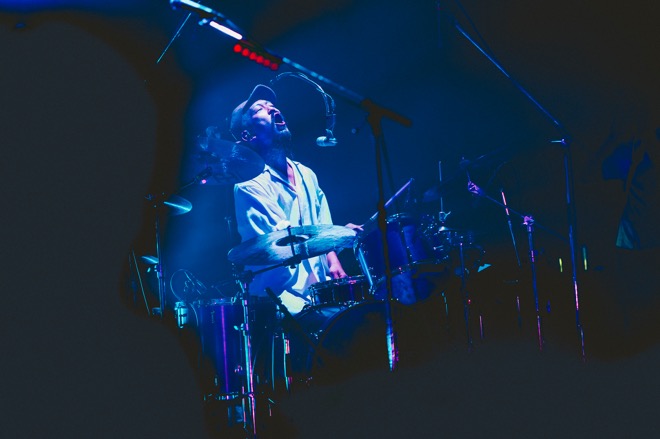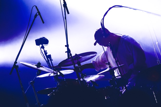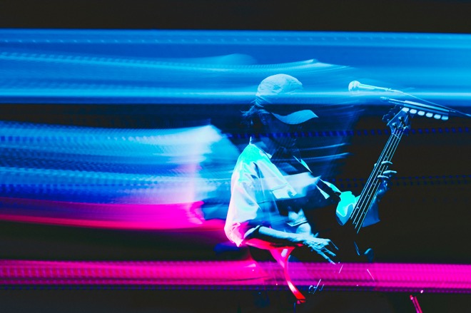 続くブロックは「Rebith」「スロウレイン」「O (オー)」「Ride the wave」。つまり新作収録曲、代表曲、めったにライヴで披露されない2曲、という流れだった。それがまったく同列な感覚で披露された上に、彼らの斬新な一面であるヒップホップのトラックのようなミニマル感を、改めてたっぷりと味わうことが出来た。2度目のMC。大木はスタンディングの情景をさらに味わうように照明を明るくすることを求めた上で口にした。