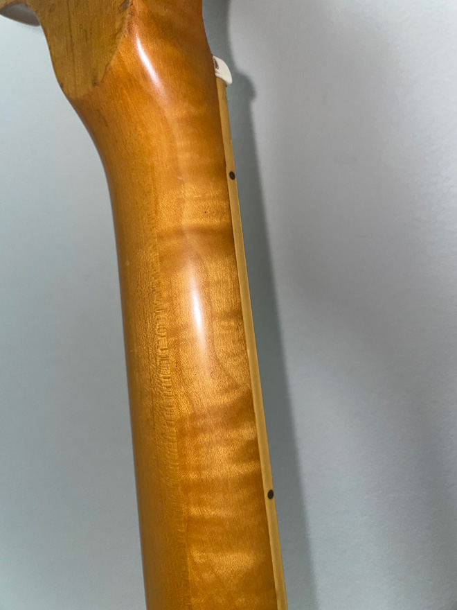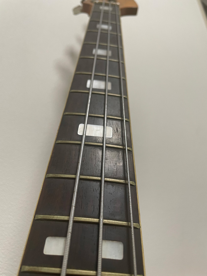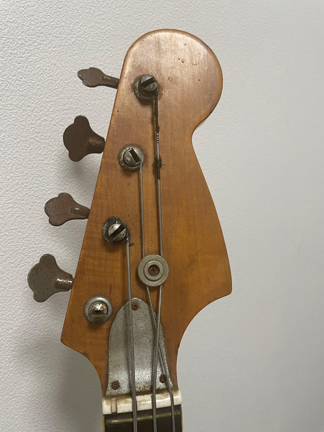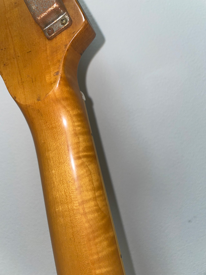 しかし木材の質は高く、ネックの虎目は主張し過ぎずも、気品の高さを演出しています。ボディの材は分かりませんが、かなりずっしりとしています。そして何より驚いたのは、購入当時の物とおぼしきフラットワウンド弦が張られていたことです。また、ヘッドのブランド名もシリアルナンバーもmade in ~の刻印も見える範囲からは無いので製造元や年代も分かりません。しかし前述した通りコピー元の情報から1960年代後半の日本製と推測しました。