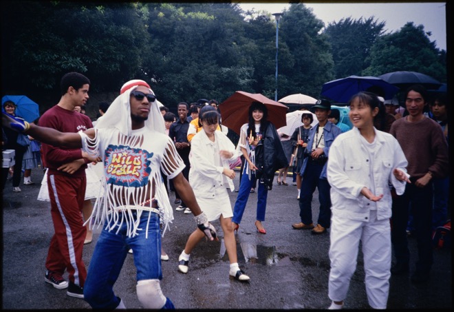 内幸町にあった広場に特設されたステージでDJとMCの音楽に合わせて、ブレイクダンスを記者団に披露。これが、日本人が初めてブレイクダンスを目撃した瞬間となった。後ろに立てられたパネルには日本の看板屋さんが制作したタイトルのグラフィック、間に来日したライターやミュージシャンのタグ(サイン)が書き込まれている。