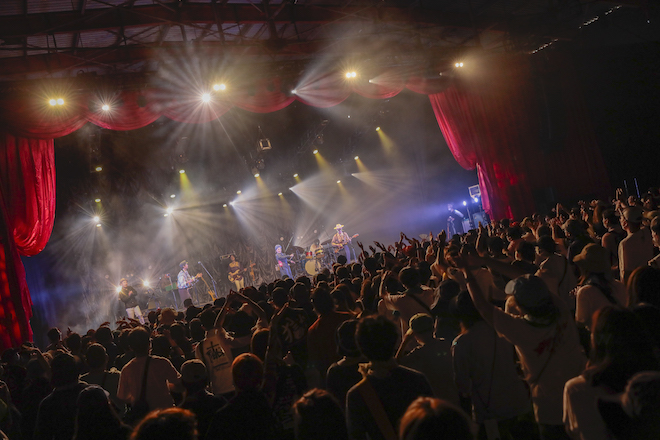 別世界を旅したところで続いたのは、管楽器による頭のワンフレーズで会場を歓喜で満たしていく「くちばしにチェリー」。フロアでは高くコブシが突き上げられると同時に、思い思いにダンスする。中納は、観客のひとりひとりを射抜いていくような熱く、挑発的な目力でもってパワフルな歌をさらに大きし、またバンドアンサンブルはどんどん濃厚になっていく。自然と大きな拍手がわき起こったエンディングに、中納も思わず歓声をあげた。