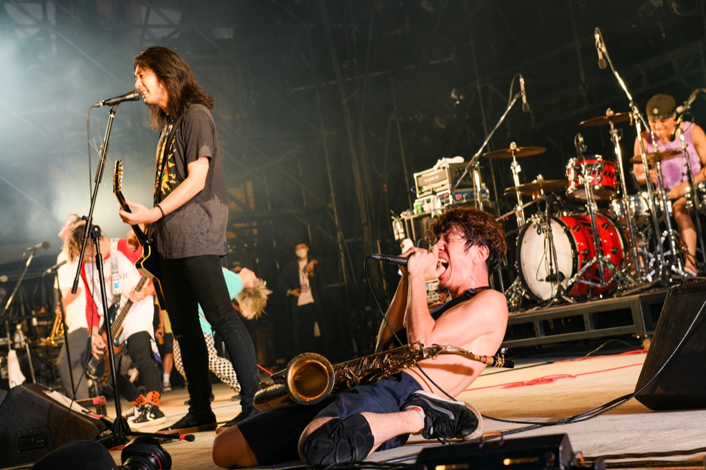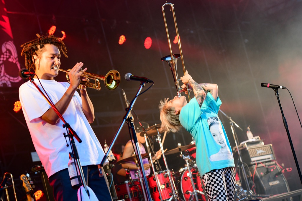 猪狩とYUJI(B,Vo)によるフロント2人の前のめり具合、強烈なショットを繰り出すTask-n(Dr)もそう。かなす(Tb)は頭を振り倒し、満(Sax)は全身を震わせ、イイカワケン(Tp)は見事なソロを披露しながら“もっと来いよ”と客席へ拳を向ける。メンバーが発する熱量が凄まじいのだ。