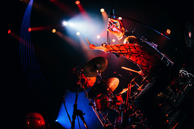 ステージの中央から客席に向かって伸びた花道の先端部分にまで移動して歌い、手にしたタオルを掲げた赤飯とぽにきんぐだむ。オメっ子たちが振り回したタオルが、元気よく飛び跳ねる大量の海老のような風景を作り上げていた「海老振り屋」は壮観だった。続いて、「日頃の鬱憤をここに置いていけ!」という赤飯の言葉通り、強烈なサウンドがオメっ子たちのモヤモヤした感情を粉砕しているのを感じた「えんがちょ!」も披露されてから迎えた小休止。コンセプチュアルではない通常スタイルによるワンマンライブは久しぶりだと語り合っていた赤飯とぽにきんぐだむであったが、ふと気がつくと赤飯のモノマネが始まっていた。桑田佳祐、井上陽水、矢沢永吉、PENICILLIN、北朝鮮の国営放送……までは正統派のモノマネだったが、雨の日の中央線(連結部分が軋む音)、新幹線のトイレも声帯模写で表現されてびっくり! しかし、「俺も1個覚えた」とぽにきんぐだむが言い、「血ぃ吸うたろか?」と間寛平のモノマネを披露した瞬間、水を打ったように静まり返った場内……。「暴力は好きじゃないけど、これしか処理の方法を思いつかなくて」と、赤飯がハリセンでツッコミを入れたりもしつつ、テンポ良く展開したMCタイムであった。