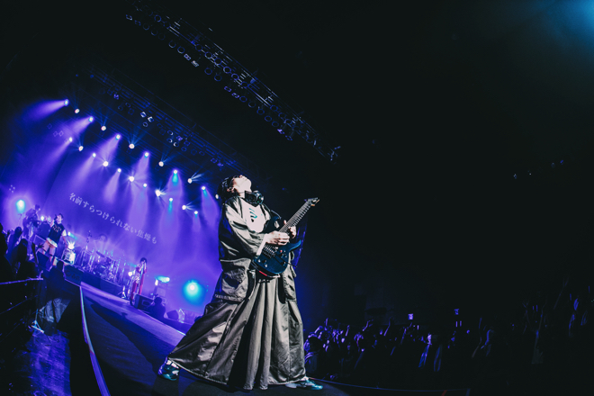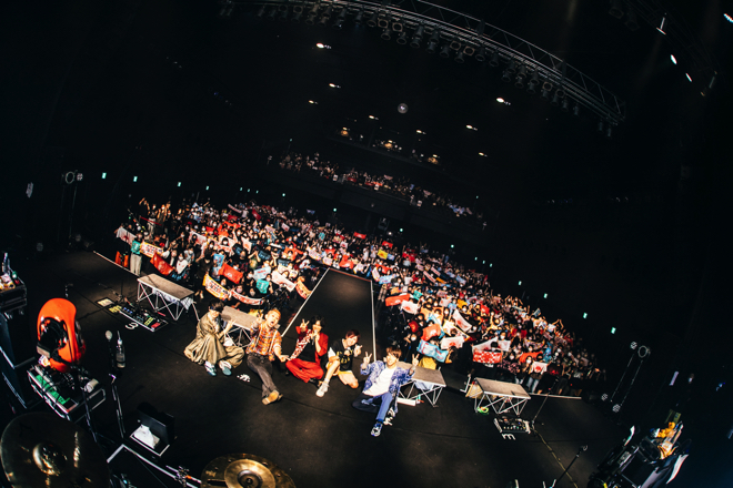 次に披露する曲がアコースティックギターから始まることに触れた赤飯。普段のライブならばそこはぽにきんぐだむが弾くのだが、彼は骨折の治療中なのでボーカルに専念している。果たしてどうするのか? 「なので今日、僕やります」と言い、アコースティックギターを手にした赤飯。「こんなに大きな会場でギターの弾き語りなんて基本的に絶対にやらないんで手震えてます。生まれたての小鹿のような腕で弾くので」と、かなり緊張している様子だったが、ギターを弾きながら「WOW WAR TONIGHT ~時には起こせよムーヴメント〜」を歌い始めた。オメっ子たちの手拍子が加わったのに続いてオメでたのメンバーたちの演奏も合流。オーガニックなサウンドが広がり、やがてラウドな曲調へと転じていく様がドラマチックだった。
