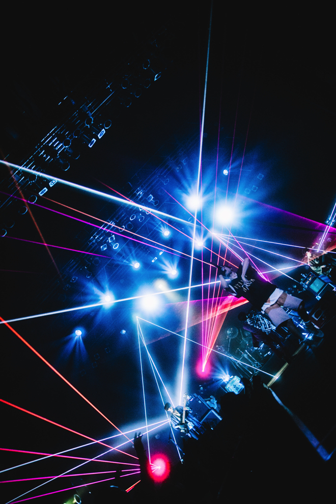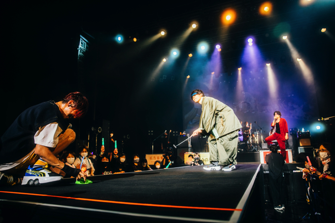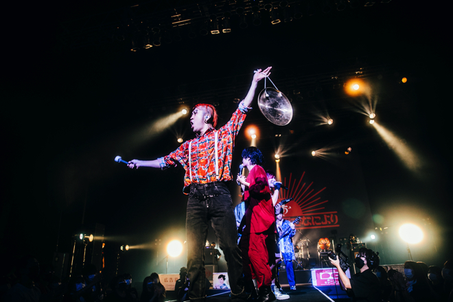 オープニングを飾ったのは「ザ・レジスタンス」。赤飯が歌い始めると、一斉に掲げられたオメっ子たちの拳。「今日は今日しか作れない最高の景色にしていこうぜ! 行けるか?」とぽにきんぐだむが煽り、サウンドが高鳴っていった。レーザービームが飛び交い、猛烈なエネルギーで満たされたZepp DiverCity。この曲が完成したのはコロナの影響が生じる前だが、この2年くらいの日々で新たな想いが託されるようになった気がする。ライブの現場に一定の制約が必要だとしても、“音楽を楽しみたい!”という気持ちを抑える必要はない。ライブを全く楽しめなかった時期に対して反逆の意志を明確に示し、“最幸”の場所を作り上げる宣言として、この曲はとても力強く迫ってきた。
