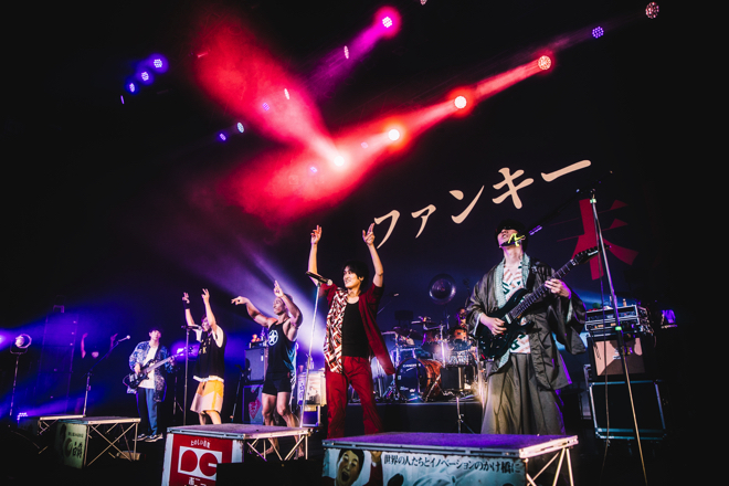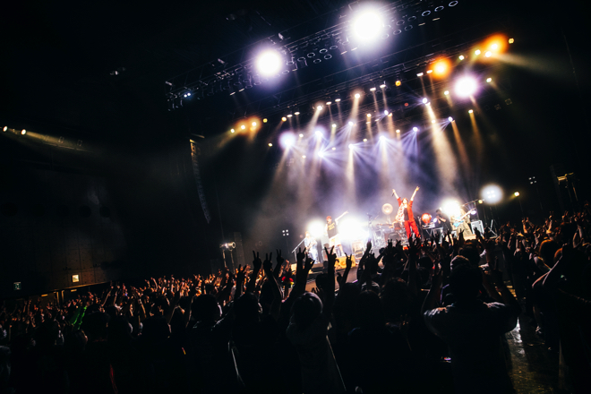 「だんだん熱うなってきたんとちゃうか? まだまだ熱くなれるやつ、手挙げろ! 全身使って騒いでみろ! こんだけ熱かったらまるでお風呂屋さんみたいですね!」と赤飯が叫んでスタートした「スーパー銭湯〜オメの湯〜」は、強烈な一撃だった。オメっ子たちが踊りまくっていた客席は、大浴場の湯船のよう。爆音で命の洗濯ができるスーパー銭湯が作り上げられていた。続いて「あれこれそれどれ」が始まっても、ビリビリと震え続けていたZepp DiverCity。そして、ラストを飾ったのは「オメでたい頭でなにより」だった。「ぶっちゃけたこと言っていい? めちゃくちゃ厳しいぞ! もう戦後みたい。笑い事じゃない。でも、ここからまた建て直してく。ライブ行く習慣がなくなっちゃったやつも多分おると思うし……でも、こうやって来てくれてるやん? まずこれがめちゃくちゃ嬉しいわけ! まだまだ足掻くから、また遊びに来て! これ、弱音じゃないからね。むしろここから反撃の狼煙を上げるっていう、そんなつもりでやってるからよお! 反撃の狼煙はこれで上げようぜ!」という赤飯の言葉に応えて、客席で掲げられた無数のWピースが綺麗だった。ぽにきんぐだむが放った「7年目に向けて絶対に反撃していく!」という言葉と共に演奏が幕切れた時、清々しい余韻が会場内に広がっていた。