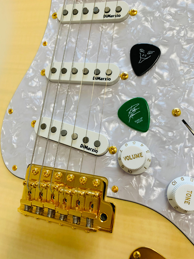 日本人の中でも手の小さい自分にはキツいかも、と感じながら続いて白いストラトを試奏。そしたら、ストラトの方が弾きやすいではありませんか!(後に調べたところテレキャスはLarge Cシェイプ、ストラトはThick Cシェイプということが判明)コッツェン師匠本人もその時期はストラトをメインに弾いていたこともあり、悩んだ挙句にそのストラトを購入しました。
