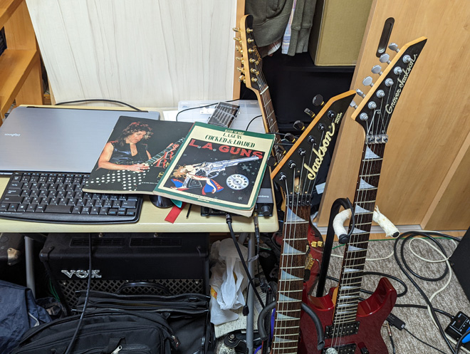 コロナ療養生活の不安に負けずに、今日は中学時代にハマった思い出のバンドスコア「LA.GUNS Cocked & Loaded」コピペ中という生活をしているメタルおじさんの夢と希望を託してくれた、思い出のジャクソンデカロゴギターで弾きまくっています。墓場に持ち込むギターまた増えてしまいましたよ(笑)