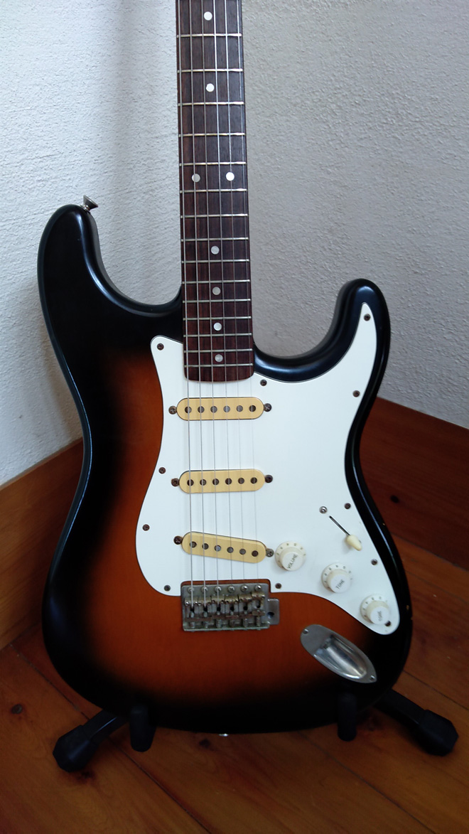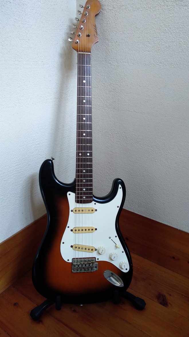 45歳を過ぎた頃、立派なハコモノを作った自治体が、ビッグバンドのメンバーを募集していました。そこで、バンド活動を再開させました。ジャズがメインなので、バンドを中断した時に、友人に譲ったセミアコを取り返しました。しかし、何だか、自分の好きな音にはならない。そこで、自宅の壁のオブジェと化していた、このストラトを復活させました。