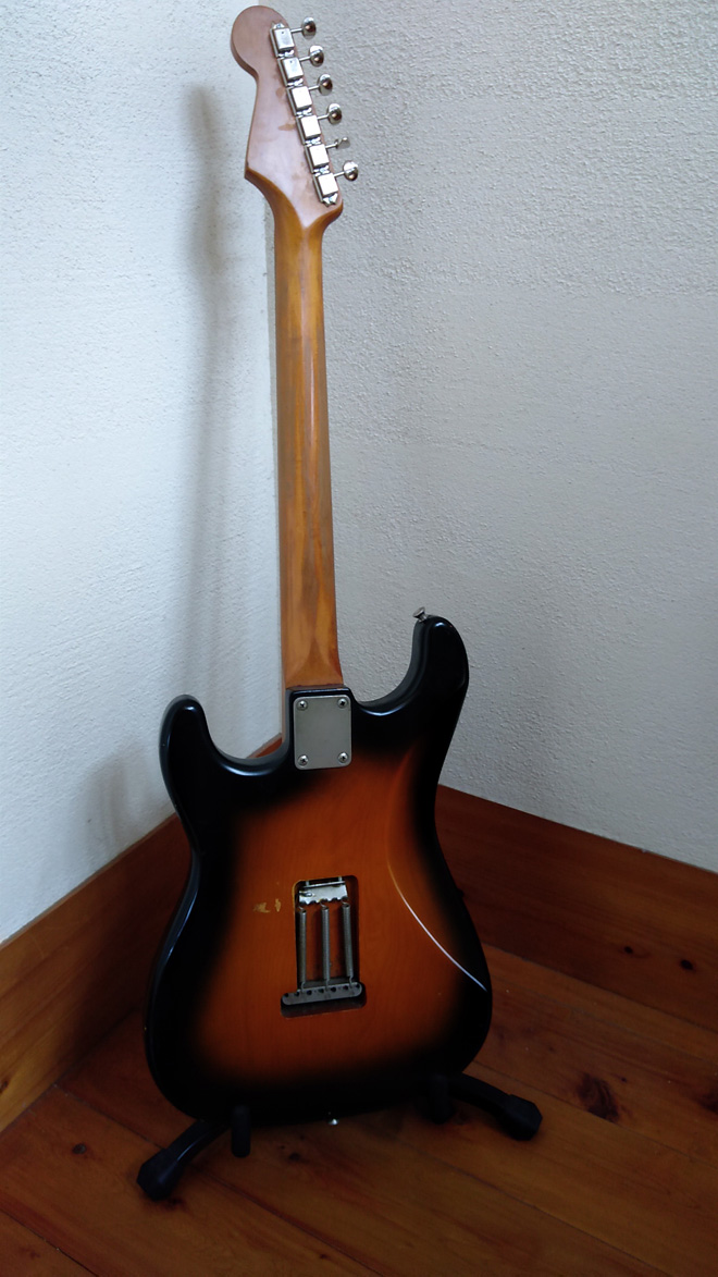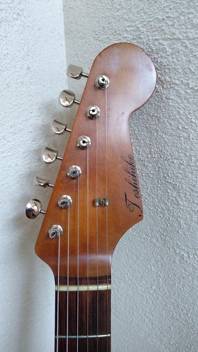 約40年前、大学生の時に買ったアーガスのストラトキャスターです。塗装むらがあるので半額の値札に、衝動的に買った記憶があります。ヘッドのブランドロゴのシールが剥がれてしまい、若気の至りで、自分の名前を転写シートで貼り付けました。