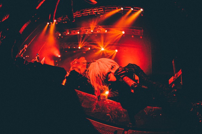「さぁ、ぶっ壊して帰るぞ! よく見とけよ」と宣言すると、自らペットボトルの水を頭にぶちまけ、水と色香が滴る姿で前髪をなでつける。サイレンの音と共に最後に披露されたのは、「MIDNIGHT CELEBRATION II」だった。持ち上げたシンバルスタンドをお立ち台に激しくぶつけるHYDE。さらに演奏中のキーボーディストに掴みかかりながら熱唱。どんどんステージセットが破壊されていく中、再びHYDEはツーバスの上で腹這いに。その後、キーボードに向かってプレイしていたベーシストの背後にしがみつき、マスク越しにキス。まさに真夜中の祝宴ならぬ、狂宴状態だ。HYDEの突然のキスに、ベーシストが背中越しに観客に誇らしげなフィンガーサインを送る中、HYDEは投げキスをして足早にステージを去った。
