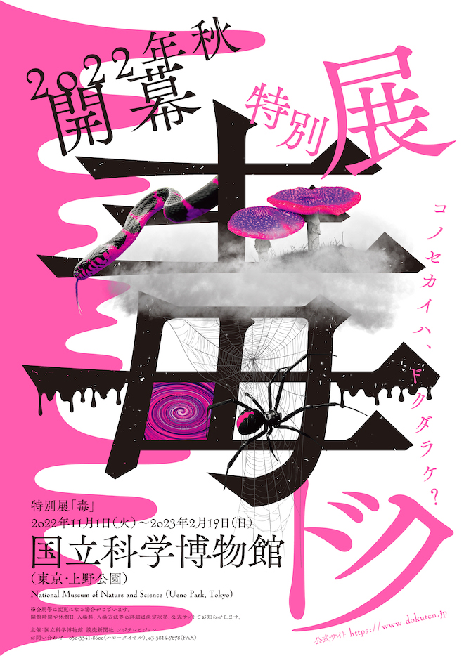 特別展「毒」は、動物、植物、菌類、そして鉱物や人工毒など、自然界のあらゆるところに存在する毒について、動物学、植物学、地学、人類学、理工学の各研究分野のスペシャリストが徹底的に掘り下げ、国立科学博物館ならではの視点で解説する企画。毒をテーマにした特別展は、国立科学博物館では初めての開催となる。