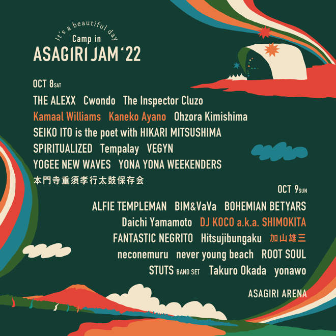10月8日(土)、9日(日)に富士山麓 朝霧アリーナ・ふもとっぱらにて開催されるキャンプ・イン・フェス<It’s a beautiful day~Camp in ASAGIRI JAM’22>の出演者の最終発表が行われた。また、日程別のラインナップも公開されている。