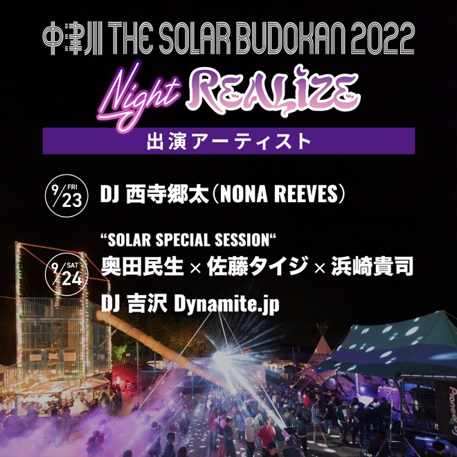 “NIGHT REALIZE”はキャンプサイト宿泊者向けのステージとなるが、各日の入場チケット(9/25入場券では観覧不可)で観覧することが可能だ。初日23日夜は、NONA REEVESの西寺郷太がDJで登場。2日目24日夜は、奥田民生、佐藤タイジ、FLYING KIDSの浜崎貴司による一夜限りの豪華セッション”SOLAR SPECIAL SESSION”ほか、DJ 吉沢Dynamite.jpも出演する。なお、“NIGHT REALIZE”の終演時間にはシャトルバスの運行が終了しているのでご注意を。チケット一般販売は各プレイガイドにて。