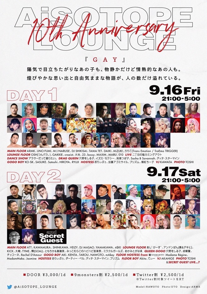 世界屈指のゲイタウン、新宿二丁目最大規模のクラブ「AiSOTOPE LOUNGE」の10周年を記念したアニバーサリーパーティ『GAY』が、2022年9月16日(金)、17日(土)の2日間に渡って開催される。