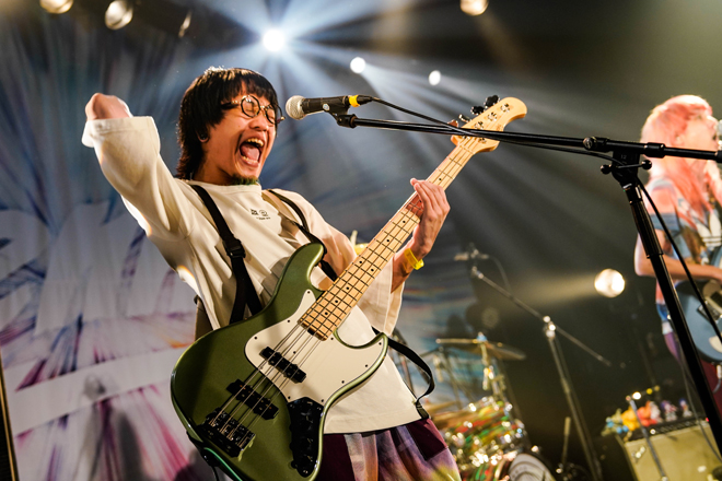 ツアーセミファイナル、名古屋の対バン相手はWiennersとは以外にも初共演だというヤバTことヤバイTシャツ屋さん。ザ・エンターテイメントとユニークとセンスとナンセンスと音楽愛をポップにごちゃ混ぜした「THIS IS ヤバT」な真骨頂バキバキなライブは、分かってはいたけれどWiennersと相性あっちゃう感じ。客観的にみてもお似合いだし、ステージ上のこやまたくや(Gt,Vo)もまんざらでもない顔をしているように見える。そんなヤバTからWiennersに向けた愛たっぷりの「ハッピーウェディング前ソング」でライブはスタート。このツーマンが大正解だってことをライブ開始と同時に六感で感じる。ヤバTのパブリックイメージって人それぞれあると思うけど、「DANCE ON TANSU」で見せるしばたありぼぼ(Ba,Vo)のスラップベースや、もりもりもと(Dr)のずっしりしたドラムなど、ライブだからこそ感じることが出来るヤバTのバンド感にも興奮する。