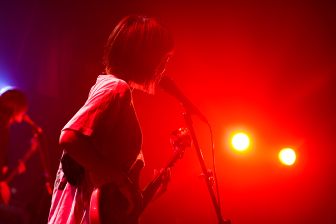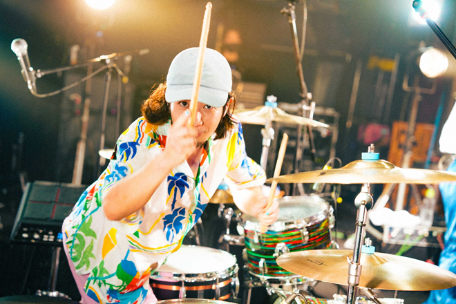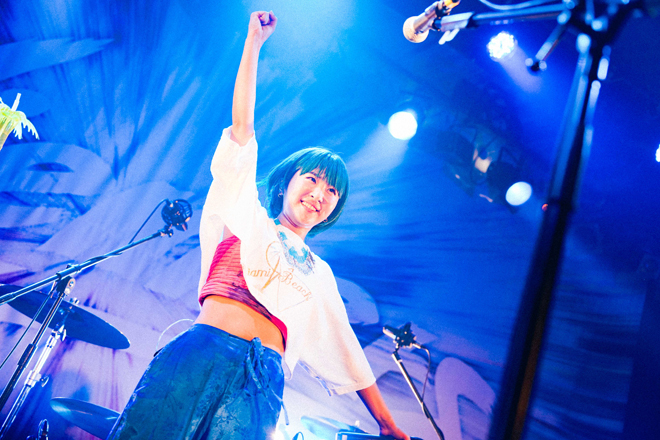 「セミファイナルだから蝉をプレゼントする」「引っ越しをWiennersの∴560∵さんに手伝ってもらった」というありぼぼワールド炸裂なMCから何故か∴560∵と付き合ってる疑惑が飛び出すゆるいトークもヤバTらしい。そんな中、こやまは「いつもの6倍の音量で!」と体力配分全く無視で「陽」なWiennersも真っ青な「ちらばれ!サマーピーポー」でギンギンの太陽を嫉妬混じりに叩きつけ、「あつまれ!パーティーピーポー」では酒はなくとも踊れなくてもロックすることは出来るぜとこれまた嫉妬混じりに大きな声で叫ぶ。さっき6倍の音量だなんて言ってたけど「くそ現代っ子ごみかす20代」では界王拳20倍くらいのスピードとパワーでライブハウスの温度を上昇させる。ちらばれって言ったりあつまれって言ったり忙しいけど「げんきもりもり!モーリーファンタジー」ではかわいい妖精までライブハウスに集まってきちゃうから大変。やっぱり楽C超えて楽Dぞ、ヤバTのライブ。