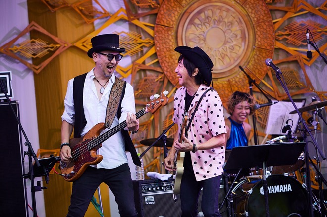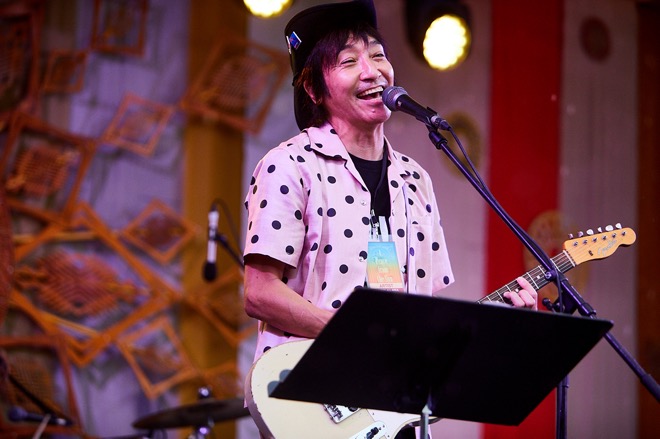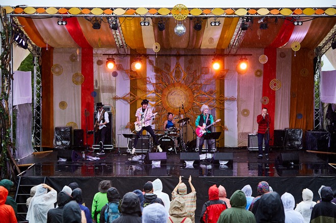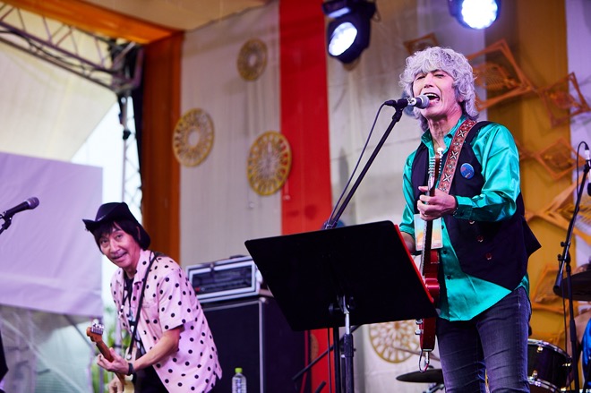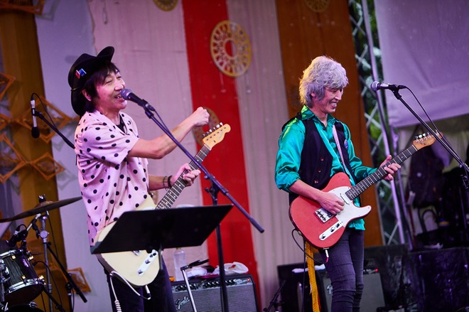 さらにモンキーズのカバーやラブソングなども挟みながら「ベートーベンをぶっとばせ」に入ったときだった。曲中でメンバーそれぞれソロを展開していったのだが、ラストの三宅伸治はステージの最前でソロを決めたと思えば、今度は歯で弾くというジミヘンばりの奏法も披露。それだけに飽き足らず、なんと、雨の降る客席エリアに飛び降り、客席エリアの真ん中あたりでギターをプレイ。雨に打たれながらソロを決め続ける銀髪のロックンローラーに、オーディエンスの熱狂ぶりも上昇するばかり。忌野清志郎との共作ナンバー「JUMP」では、メンバーもオーディエンスも、絶えない笑顔でロックンロールに酔いしれた。