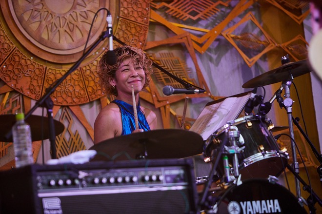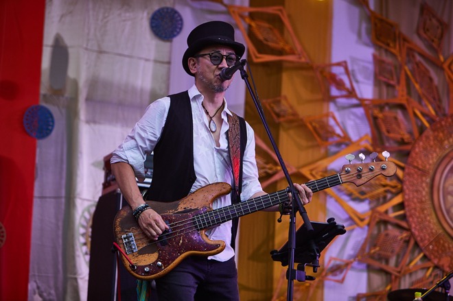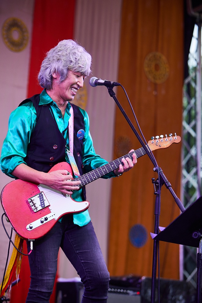 それを合図に高橋“Jr.”知治(B)、茜(Dr)、KOTEZ (ブルースハープ)、ウルフルケイスケ(Vo, G)がロックンロールを軽快に鳴らし始めた。互いにアイコンタクトしつつ、笑顔の5人。とにかくロックとバンドと演奏するのが大好きというオーラ全開。それに好きなことやってるから全員、若々しい。リズムに乗ってフロントの4人はジャンプや軽快なステップも。するとオーディエンスも一緒になってジャンプ。悪天候だが、心を晴れやかに、そしてハッピーにさせるロックンロールを、三宅伸治 & the spoonful with ウルフルケイスケは鳴らし続ける。