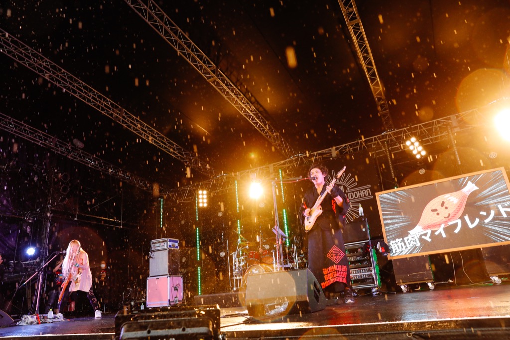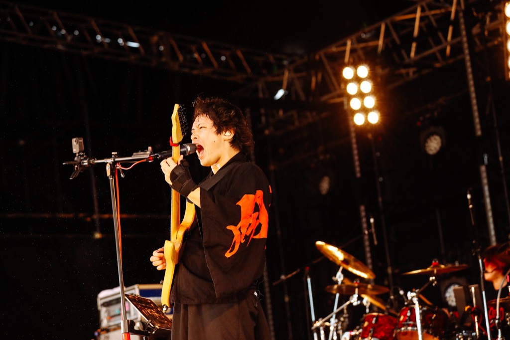 このアンセムで景気づけて、「元気良くまいりましょう!」と大澤敦史(Vo,G)が声を上げると、ステージ中央にレキシ・池ちゃん(池田貴史)の陽気な等身大(?)パネルが登場して、レキシとのコラボ曲「鬼の副長HIZIKATA feat. ぼく、獄門くん」へ。キャッチーな《ひじ ひじ ひじ ひじ》《かた かた かた かた》のリズムに合わせて肘や肩を揺らす観客、そしてヘヴィなブレイクダウンではjunkoのアグレッシヴなヘッドバングに合わせ観客も大きく頭を揺らす。続く「筋肉マイフレンド」では、バンドも観客も一斉にスクワットをし、超重量級のギターリフや河本あす香(Dr)によるどっしりとしたビートに力強くコブシを振るった会場に向け、大澤が”Victory!“と快哉を叫ぶ。のっけから雨を弾き飛ばすパワーだ。