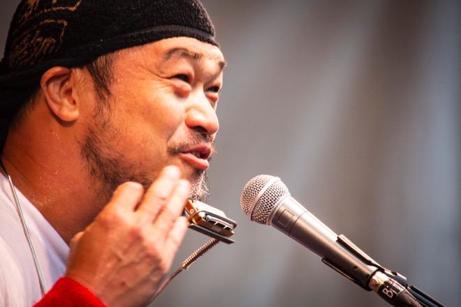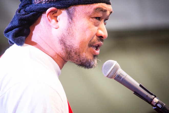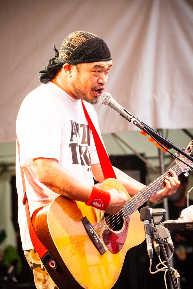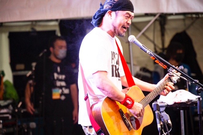 アコースティックギター1本と頭に巻いたタオルだけを持って、<中津川THE SOLAR BUDOKAN>のステージに臨んだ竹原はこの日もアコースティックギターを無骨にかき鳴らしながら、声を振り絞るように歌う気迫に満ちた歌声で観客を終始、圧倒したのだった。それこそが竹原の魅力だと言うことに異論のある人は、まずいないとは思うが、実は見どころと言うか、聴きどころはもう1つ。バラードの「おーい!おーい!!」、ラップの「ギラギラなやつをまだ持ってる」、ポエトリーリーディングの「初詣」というように序盤から印象付けた楽曲の振り幅も忘れることはできない。