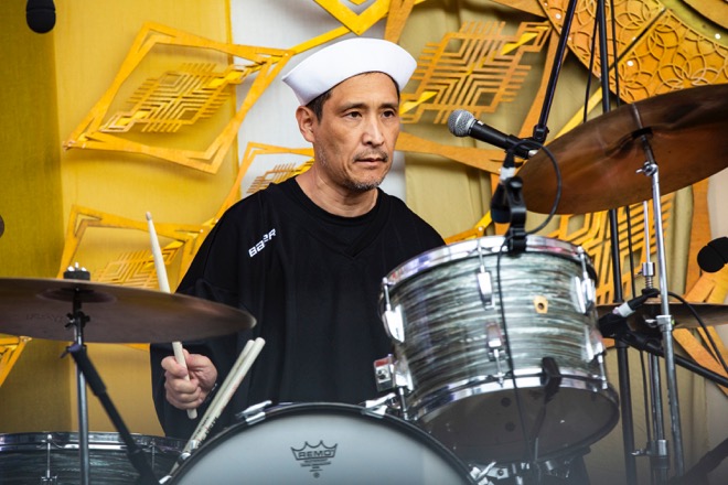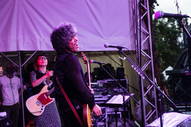 そんな楽しいハプニングもありつつ、ラストに披露したのは「ソノラ砂漠のドレッドライダー」。個性的ミュージシャン集団とも呼べるTAIJI at THE BONNETだが、曲それぞれは広い間口を持ち、飛び込んでくるフックもある。それでいてフレーズを幾層にも重ね合うように作り出すスケール感や奥行を、心地よさと共に聴かせる場面も。この「ソノラ砂漠のドレッドライダー」でも、佐藤タイジはボトルネック奏法で空や宇宙に溶けていくようなメロディとフレーズを奏でた。雨の夕暮れの中津川というシチュエーションもあって、実に幻想的で美しい。そんな光景と共にTAIJI at THE BONNETの曲を楽しむオーディエンスだった。そして曲がエンディングを迎えたとき、<中津川 THE SOLAR BUDOKAN>のオーガナイザーでもある佐藤タイジは、こう叫んだ。