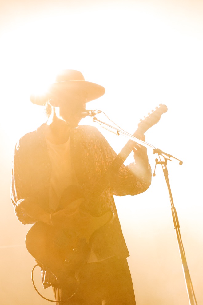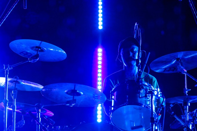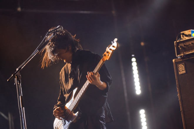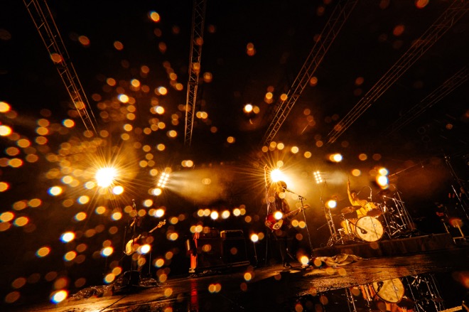 と♪ジャラ〜ンとギターを奏でたりと、この場所を分かち合う人との時間を慈しむ。最後の最後まで全力でやりたいと言って続けた曲は、「赤橙」。ステージに灯ったオレンジの照明が雨に滲んで見えて、いつになくドラマティックだ。パワフルなドラムのキックと単音のギターから、サビで一気に爆音をバーストさせる「夜のために」や、前半のハイライトとなった物語的な「innocence」など、昨年リリースした12枚目のアルバム『INNOCENCE』の曲が演奏された。ドラム、ベース、ギターという3つのシンプルな音で、心にダイレクトに届け、あるいはどこまでも想像力の両翼を広げてくれるようなアンサンブルを聴かせる。このステージでは、その3人のアンサンブルによりフレンドリーな温度が感じられる。大木はMCで「最高の景色です」と語りかけた。