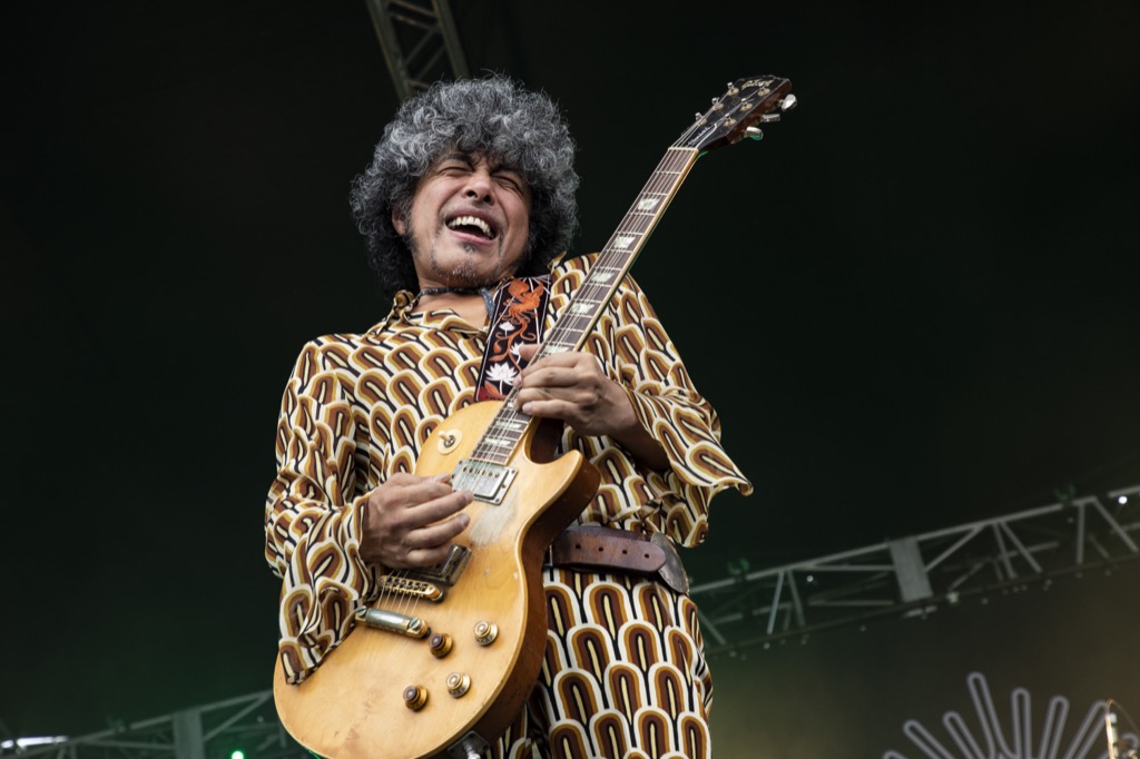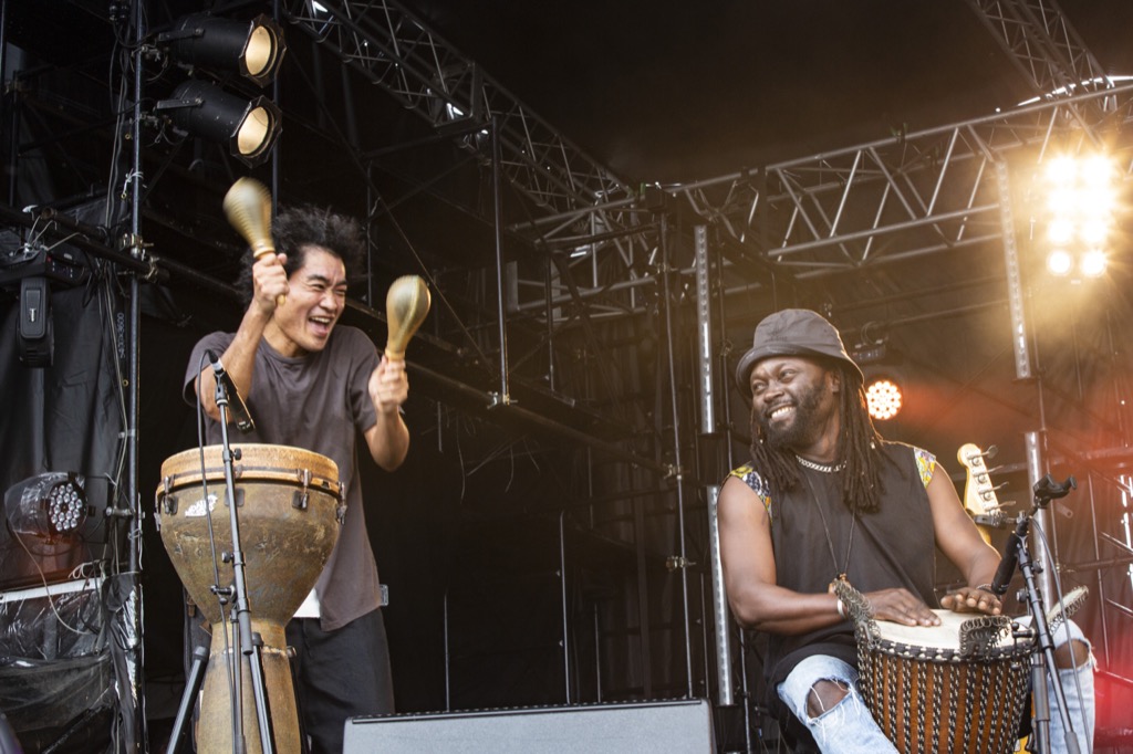 ステージにはジャンベ奏者としてオマール・ゲンデファル、辻コースケが飛び入り。二人の叩く野性的リズムにギターで絡む佐藤タイジ。その勢いのまま突入した「音楽は終わらない」は、ロックもファンクもラテンも何もかも飲み込んだワールド・ミュージックだ。客席エリアでは、メキシコのお祭りを思わせる巨大な骸骨人形が踊り、オーディエンスも自由に身体をうねらせ、生きている喜びと音楽の楽しさを全身で感じ続けた。