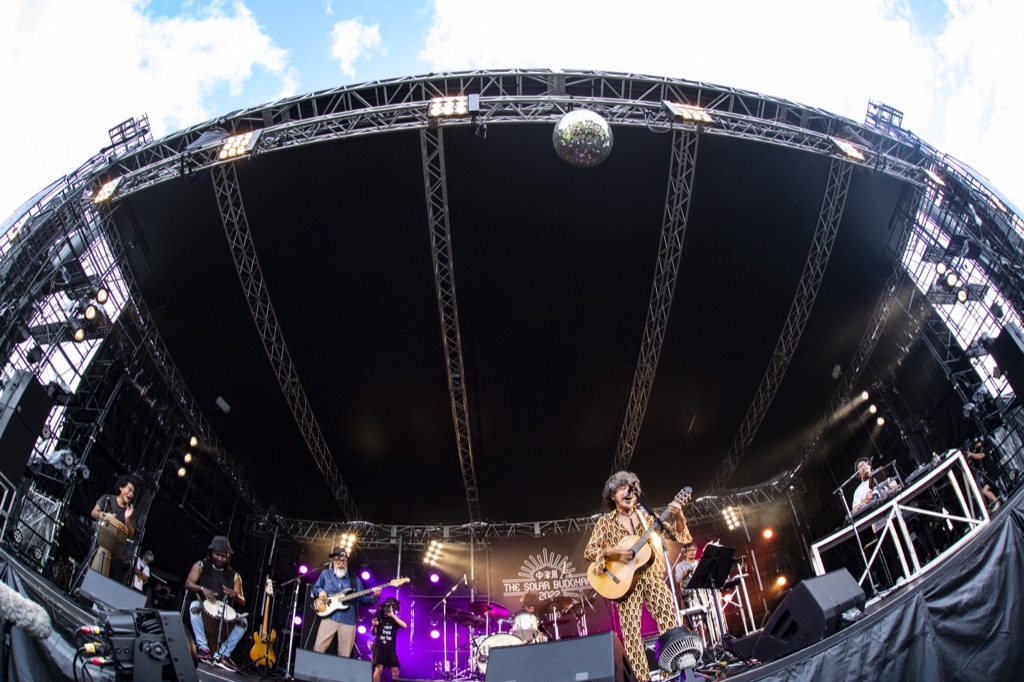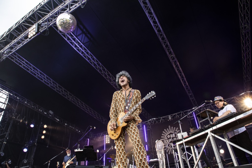 こうして感動的に始まったシアターブルックのライブ。だが「あふれ出すばかり」からはファンキーなグルーヴで、会場を自然の中に生まれた巨大なダンスホールへと変える。リズムやオーディエンスからのバイブレーションも感じながら、インプロで自由自在にフレーズやカッティング・プレイを聴かせる佐藤タイジ。そのフレーズも弾く姿も、最高にセクシーでカッコいい。