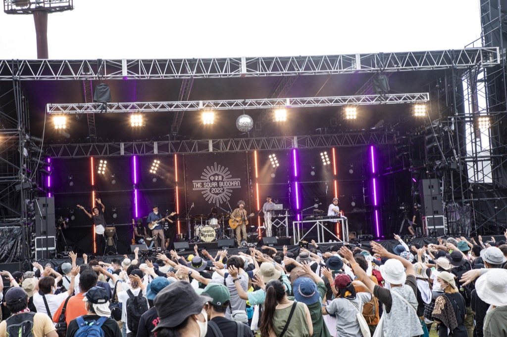 「気持ちいい。しかも、音いい。音いいっすね。素晴らしいっすわ。いや、でもホント晴れて良かったですね。昨日とかやって思った。久しぶりやん、有観客で中津川でやるのは。安定感が違うね。<中津川 THE SOLAR BUDOKAN>はズッシリしてる、10年目やしっていう感じで。この安定感、すんばらしい」