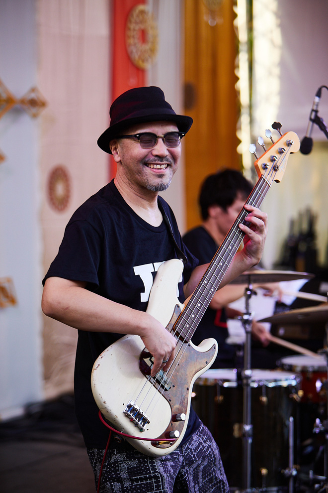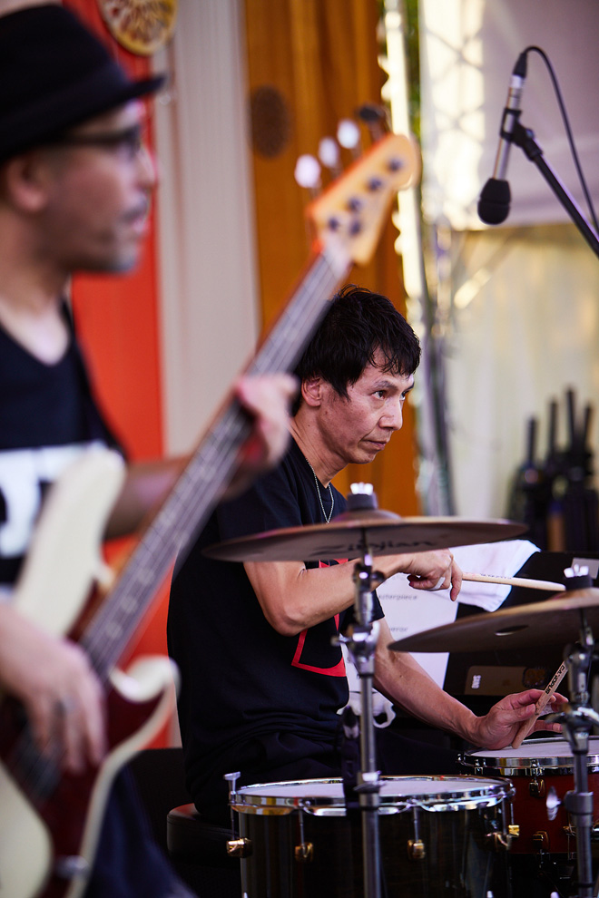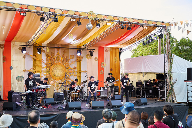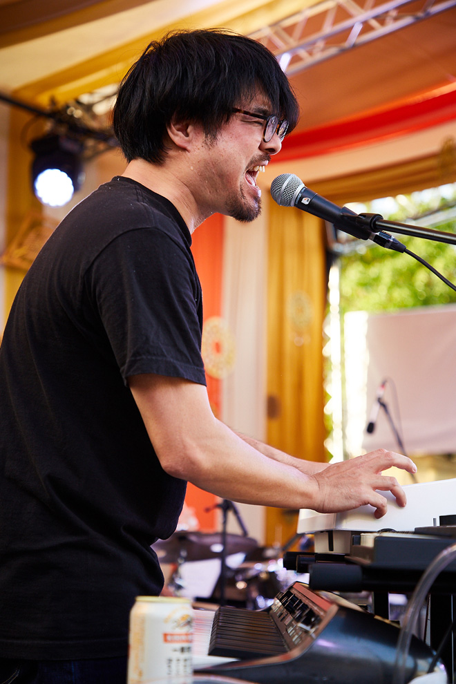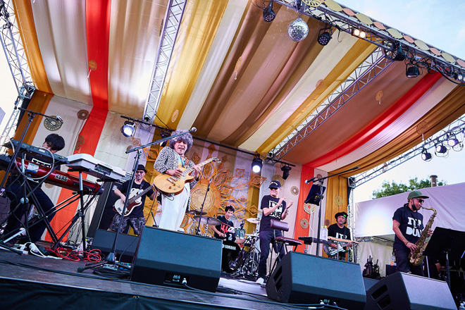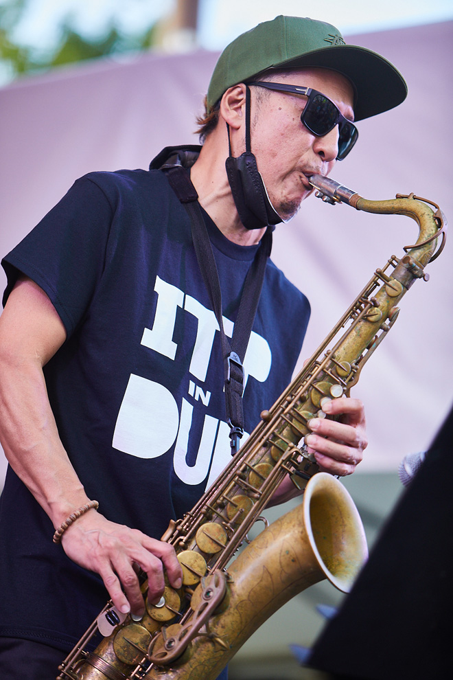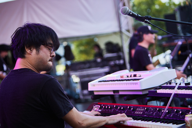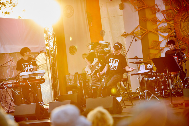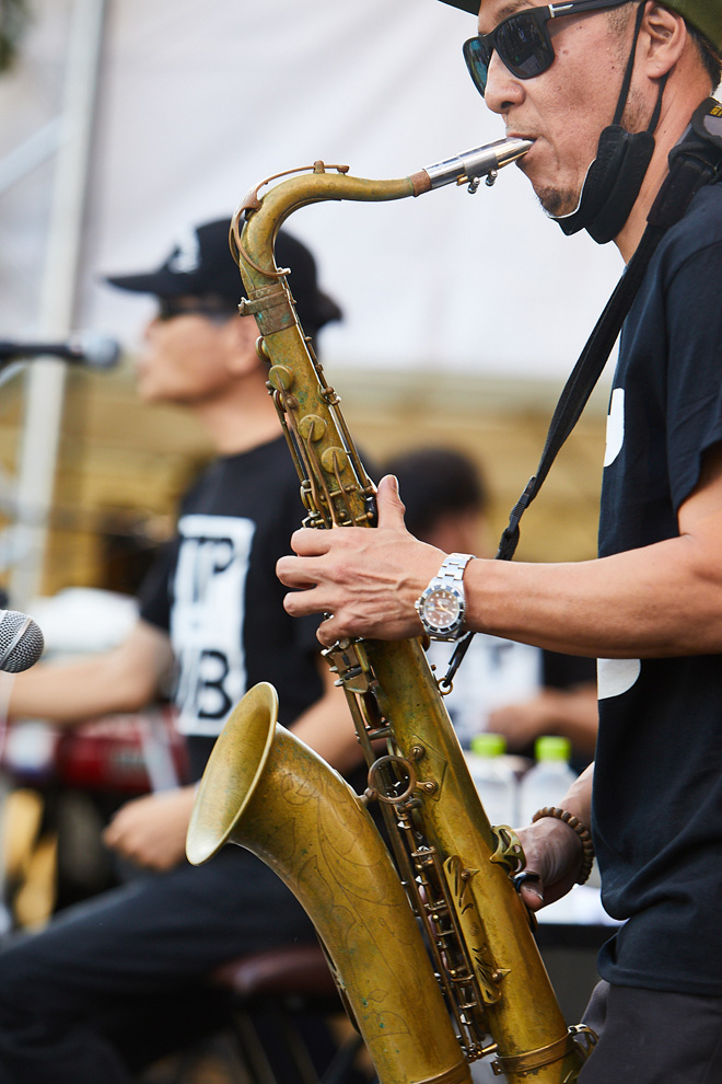 そんな言葉とともにWatusi(B)、會田茂一(G)、佐野康夫(Dr)、龍山一平(Key)、コバヤシケン(Sax)という卓越したミュージシャンがインプロビゼーションを加えたプレイを見せ、SUGIYA-MAN(DUB MIX)がリアルタイムでダブ処理をし、極上の仕上がりとなったサウンドを浴びていくのだからたまらない。言葉と音が拮抗し、あまり味わったことのない揺らされ方。ただ、そこに嫌な緊張感はない。ここから一歩も動いちゃいけない、縛られているようなプレッシャーは存在しなく、言葉と音に身を任せ、フリースタイルで踊っていける。