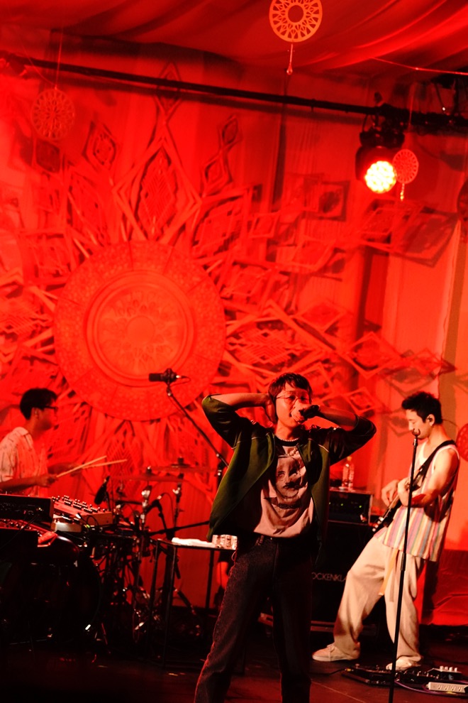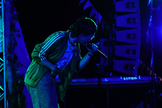 「NEW ERA」の軽やかなグルーヴに揺れながら「気楽にいきましょう、体を揺らして」と、柔らかなボーカルをドライヴさせる。「どうやら、太陽光というのは音がいいらしいですね。ここからは聴こえる音に耳を傾けて、好きに踊ってください。こっちなんて見なくていいので」と言うと、自身も洒脱で気持ちのいい「Super Sonic」のリズムに体を揺らす。音源でのポップさ、様々なシチュエーションや心情の最良なサウンドトラックになる洗練された音の設計ともまた違って、ライブではドラム、ベース、ギターふたりに、鍵盤によるバンドアンサンブルの躍動感、それぞれの楽器が主張しせめぎ合う泥臭さも感じられていい。「Super Sonic」では、ドラムからベースへ、そしてギターからキーボードへとソロをつないでショーアップしながら、華やかな空間を作り上げていった。