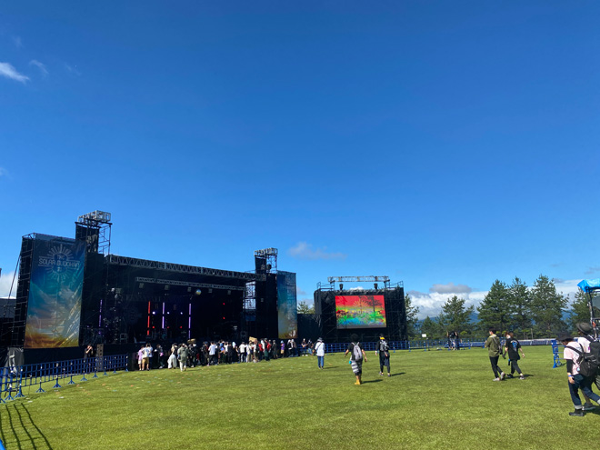 10時開場とともに、なだれ込んでくるオーディエンスの笑顔も輝き、すでに会場は多幸感に満ち溢れている。初日は降り続く雨に体力も吸われ寒さ対策も必要となったが、今日は激しい日差しと脱水症に気をつける必要がありそうだ。それぞれに体調管理を整えながら、最高のひとときのカウントダウンを楽しみにしている様子がうかがえる。