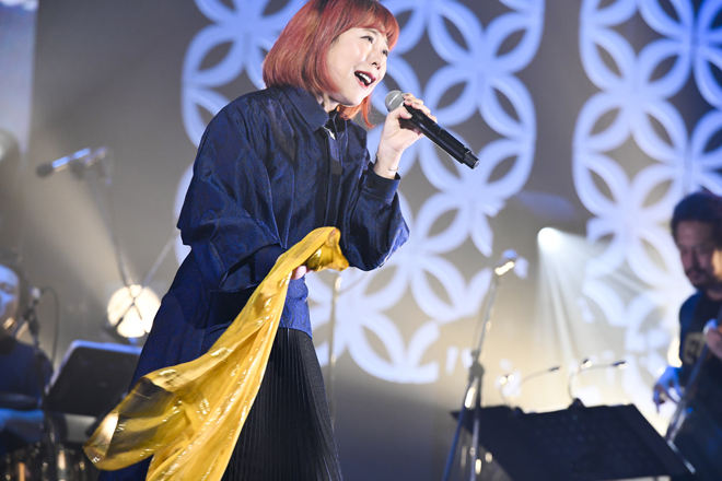 そんな歌謡番組風の流れの中で、華々しく響き渡るのは久保田利伸 meets KREVA名義による「M☆A☆G☆I☆C」。2人が歌い出す瞬間にロゴ入りのカラーテープが放たれ、軽やかなステップを踏みながらソウルフルな歌唱力を刻みつける久保田利伸である。ここでKREVAは、力強いR&Bのみならずしっとりとしたバラードも久保田利伸の持ち味であることを力説し、往年のシングル曲「Cymbals」をリクエストする。作曲は、KREBandの柿崎洋一郎によるものだ。味わい深い節回しで歌い上げ、ミラーボールの反射する光が武道館の天井に映り込むさまは、さながら瞬く星々のよう。歌詞と視界が折り重なって、何ともロマンチックな一幕である。