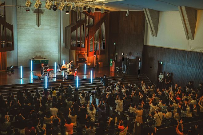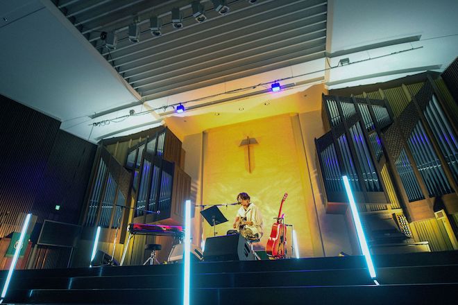 厳かな雰囲気のガウチャー記念礼拝堂にアコースティックギターを携え、川上がひとり登場。静けさの中、おもむろに [Alexandros]の3rdアルバム『Schwarzenegger』のラストを飾る「真夜中」を演奏する。しっとりとした歌とアコギの音がどこか神聖な空気をまといながら、礼拝堂内に響き渡る。続いては「city」。原曲は「前に前に」というエネルギーが詰まった疾走感のある楽曲だが、それとは大きく違う表情を見せる。ただ、徐々に演奏と歌はスピード感を帯び、オーディエンスの心をパワフルにつかむ。川上は「Thank You」と呟くように口にし、笑顔を浮かべながら次の曲に向かう。アコギを奏でながら、「今日はわが母校に来てくれてありがとう! 第29回 青山学院大学同窓祭ということでお招きいただきありがとうございます! 声は出せないと思いますが手を叩いて大盛り上がりしましょう!」と言って、「アルペジオ」へ。アコギと歌だけでダイナミックな音像を描いていく。