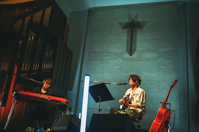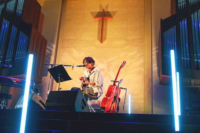 「僕は青山学院大学のOBなんですけど、多分このチャペルに入ったのほぼ初めてなんですよね。ロックバンドをやってると無縁だと思ってました。普段は牧師さんがいらっしゃるようなところでアコギをかき鳴らして良いのかな?って思います」と言い、母校であり[Alexandros]結成の地であるこの場所への敬意を払う。さらに、「2年留年した自分が本当にここでライブをやっていいのでしょうか?(笑)」と自虐を交え再びオーディエンスに確認し、場内をほっこりさせる。