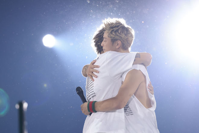 続く、EXILE THE SECONDパートに突入すると「Going Crazy」に導かれたパーティータイムは、タオル回しで一気にヒートアップ。「YEAH!! YEAH!! YEAH!!」や「ASOBO!」では、いつもは最年長らしく振る舞っている橘ケンチやTETSUYAも、アンダーグラウンドで出会った頃のようなやんちゃな笑顔を浮かべ、遊び心溢れるパフォーマンスで観客を沸かせる。と思いきや、「瞬間エターナル」では息の合ったダンスを見せつけ、仲間と築いたものの大きさを刻み付ける6人。最後は、AKIRAの加入後、6人体制のEXILE THE SECONDとして初めて発表したシングルから「RAY」を届け、颯爽とステージを後にした。