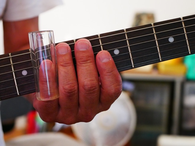 ギターにおいて、弦を押さえる指にはめ、弦上を滑らせるように使用して音程を変えるボトルネック奏法(スライド奏法とも呼ばれる)で使われる円筒形の器具。ブルースやカントリー、ハワイアンといった音楽で多用される。