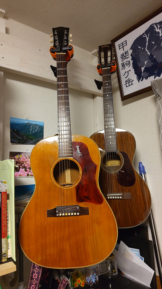 ピックガードにGibsonロゴがあるのは1968年頃というが、コイツはシリアルNo.からすると1965年製。ファクトリーB級品かピックガード張替えか。まあなんでもいーや。低音弦と高音弦の音量バランスが良いので、ソロギター、ブルース、ストロークとなんでもOK。ナローネックだけど、厚みがあるから弾きやすいし。どうも最近高音のキラキラした音が苦手になってきていて(歳のせい?)、ハカランダブリッジの柔らかい音色が心地良い。