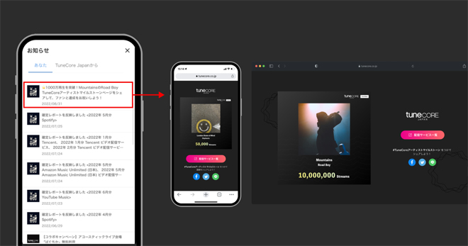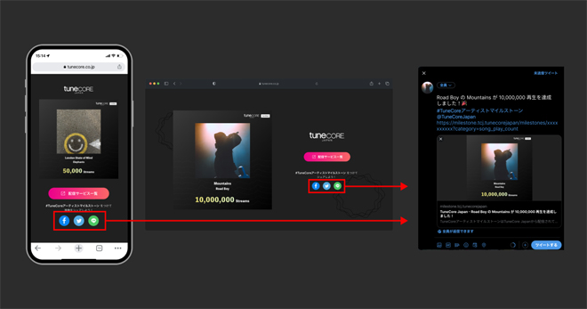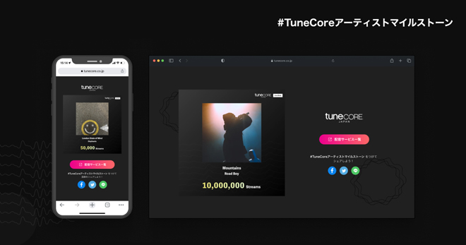 「アーティストマイルストーン」はTuneCore Japanから配信されている楽曲やアーティストの累計ストリーミング再生数が節目を達成した際に、誰でも簡単にファンと共有することができる新機能。TuneCore Japanを利用しているアーティストは、配信されている楽曲またはアーティストの累計ストリーミング再生数が「10,000再生を突破」「5,000,000再生を突破」といった節目を達成するごとに、お祝いのマイルストーンイメージとマイルストーンページが自動で生成され、記念すべき瞬間を見逃すことなく、ファンと共有することができる。