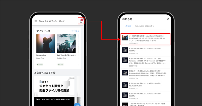 配信楽曲またはアーティストの総ストリーミング再生数の節目にお知らせとメールが届きます。