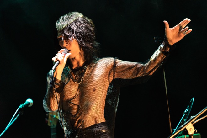 ここで岡野、森永、平田が一旦袖へと下がり、咲人(G/NIGHTMARE)が呼び込まれた。もちろん、曲は彼がアレンジを手掛けた「Promised Land」だ。原曲のパーカッシヴなリズムを踏襲した多彩な音。MORRIEはそのギターのニュアンスにロバート・ワイアットの「Sea Song」を思い起こしたと話したが、そこが咲人らしいセンスの一つなのかもしれない。ライヴの場でもアコースティックギターをアクティヴに奏で、コーラスも担当しながら盛り上げる。ギターソロパートで客席に背を向けて踊るMORRIEの姿も印象的だ。