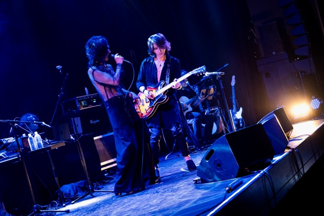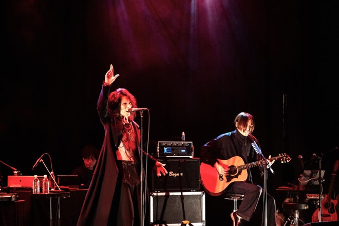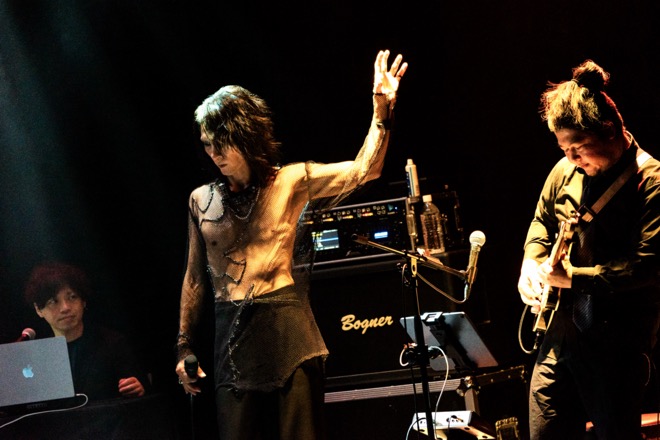 アンコールでは開演当初の4人の奏者が再び揃い、ゲストにSUGIZO(G/LUNA SEA)も登場。彼は、YOUはもちろん、MORRIEとも結びつきの強い青木裕(G/downy)の名前も挙げながら、先に逝った仲間たちとつなげる役目こそ、自たちが音楽を奏でる「使命」であるといった旨の話をする。このステージに立つに当たっての意思でもあったのだろう。音源にはなかった、まさにレクイエムであるかのようなSUGIZOのギターによるイントロダクションから「Serafine」は始まった。DEAD ENDが1989年の日比谷野外大音楽堂公演で披露したライヴヴァージョンをベーシックにしたという狙いも頷けるダイナミズムを感じさせつつ、繊細にフレーズを届けていくSUGIZO。その傍らに立ち、魅惑的に声を響かせていくMORRIEにも、この瞬間だからこそ湧き上がる思いもあったはずである。