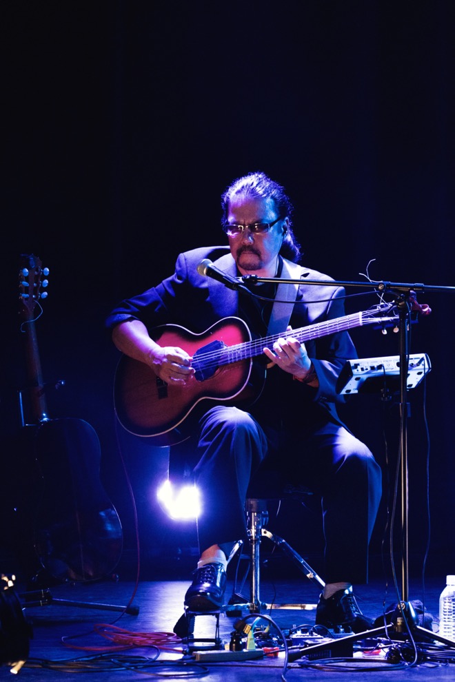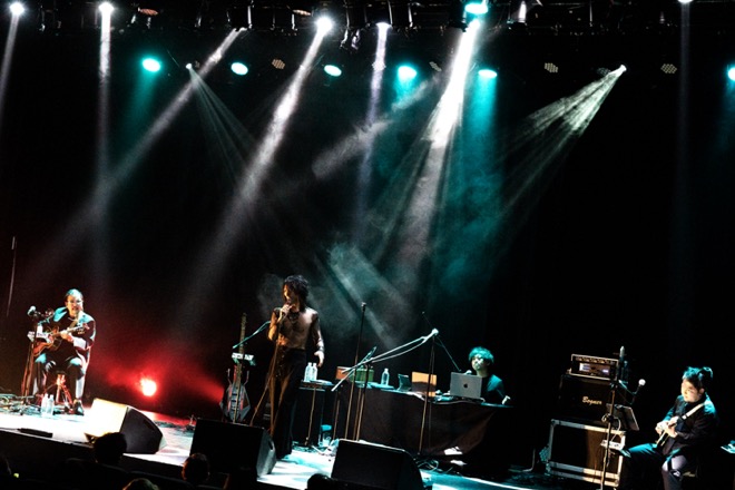 定刻通りに場内が暗転すると、舞台に登場したのは4人のミュージシャン。DEAD ENDの作品群と同じく『Ballad D』のプロデュースを務めた岡野ハジメ(B)、同作のアレンジや演奏を担当した平田崇(G)と森永浩之(G)、そしてMORRIE関連の作品にエンジニアとして参加してきた田本雅浩(manipulator)である。彼らが定位置につき、森永がスパニッシュなギターを奏で始めると、次第に他のメンバーも音を重ねていく。この即興は5分ぐらい続いただろうか。おそらく誰もが予想していなかった幕開けだった。
