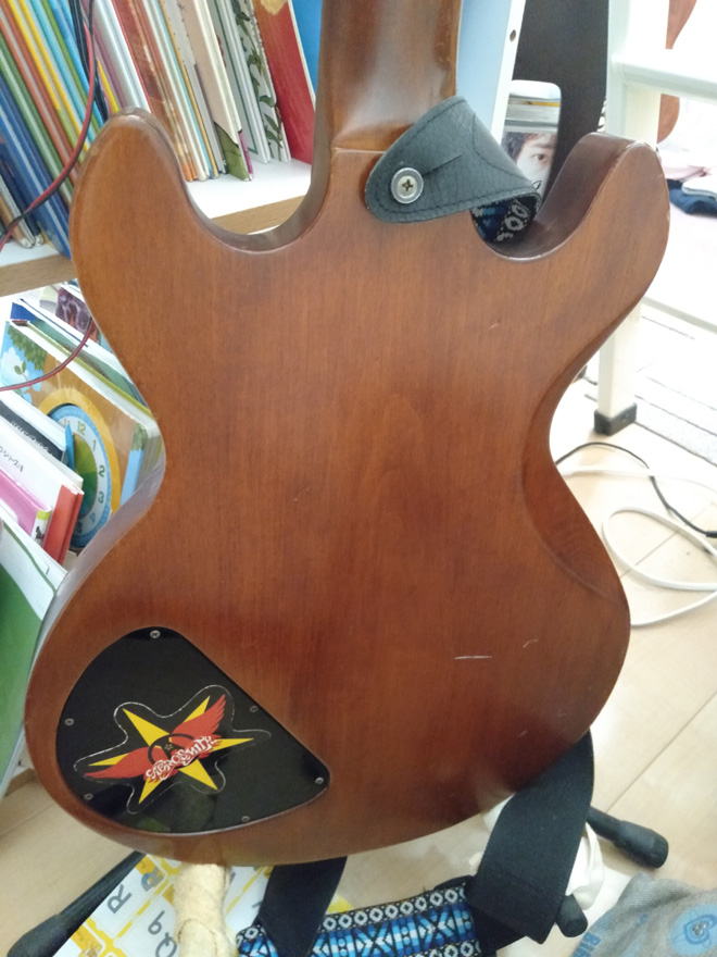 裏側にエアロスミスのステッカー、表側に槇原敬之のステッカー。このチグハグな感じが恥ずかしくもありつつ、自分らしいなと思う今日このごろ。ちなみに、このギターは私とほぼ同い年なので、これからも一緒に歳を重ねていきます。