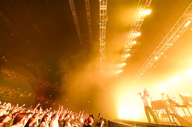 後半は“鉄板”の連続。彼らのロマンティシズムが全開の「Jumbo」がそのシングルのアートワークと同じレッドとイエローのライティングに照らされるなか披露され、カールが満面の笑みを浮かべる。暴力的な「King of Snake」のビートが鳴り響くと、アリーナからは狂乱状態の叫び声が止まない。音の中枢を担うリックの後ろで、カールが背中をあわせおどける。「Rez / Cowgirl」の人間の本能を呼び覚ますグルーヴ、エレクトロニックな音色を用いて肉感的なグルーヴを生み出してきた彼らのクラシックだ。白いブラウスを揺らめかせながらとにかく自由に歌い踊り、妖精のようにステージを駆け回っていたカールが感極まったように「みんな気分はどうだい!?」と叫ぶ。