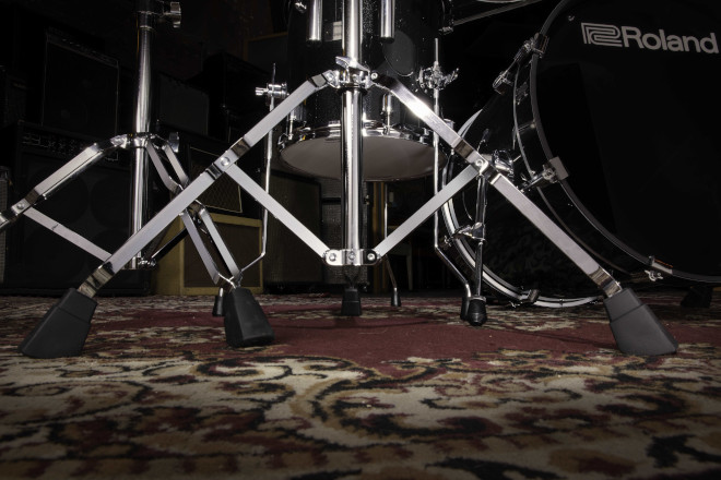 「Vドラム・アコースティック・デザイン・シリーズ」のドラム・パッドには、木製のシェルを採用しドラムらしいルックス。また、ドラム・パッドやシンバルを設置するスタンドは、可動域の広いボールクランプを備えたダブルレッグ仕様。より自由なセッティングが可能となったほか、安定性が高まった。
