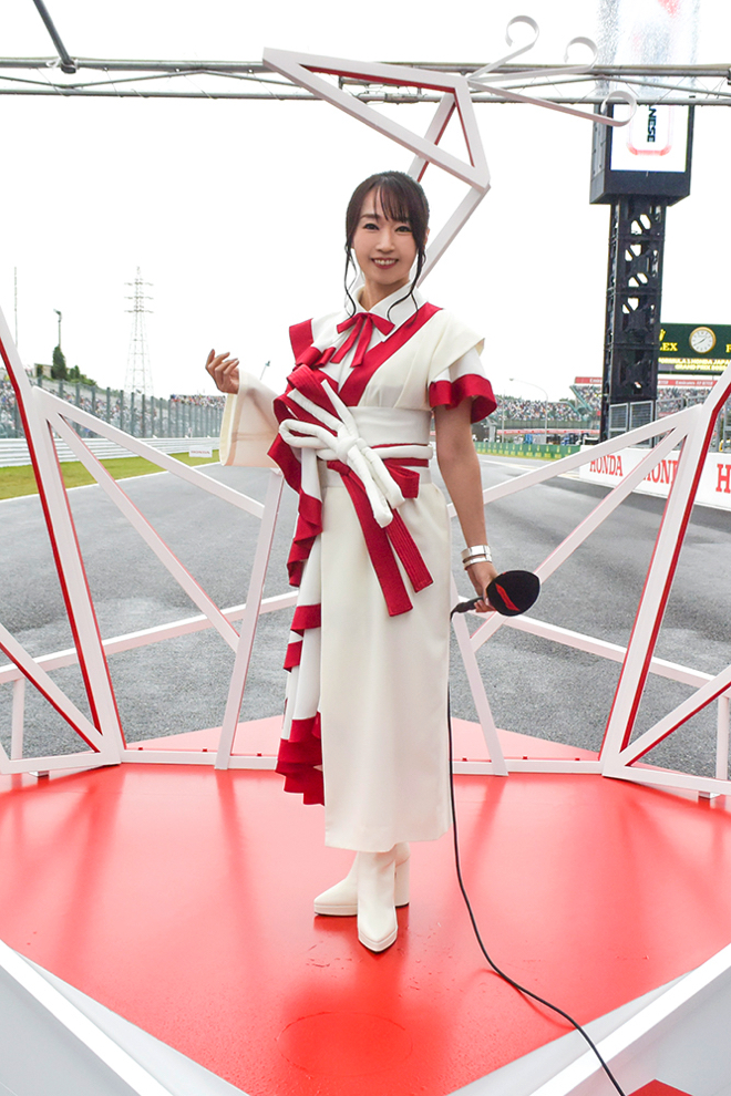 決勝レースが行われた10月9日(日)の観戦チケットは完売しており、当日は約94,000人を動員。3年ぶりの日本GP開催ということもあり、多くのF1ファンで会場が埋め尽くされ賑わう中、決勝レース前セレモニーにて国歌独唱を披露した。
