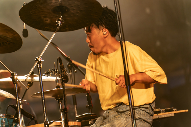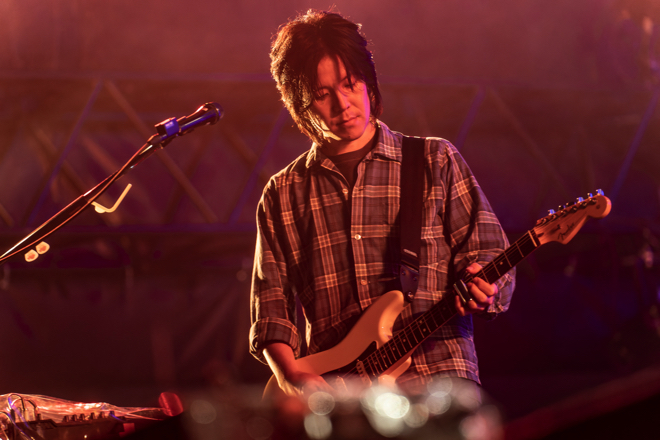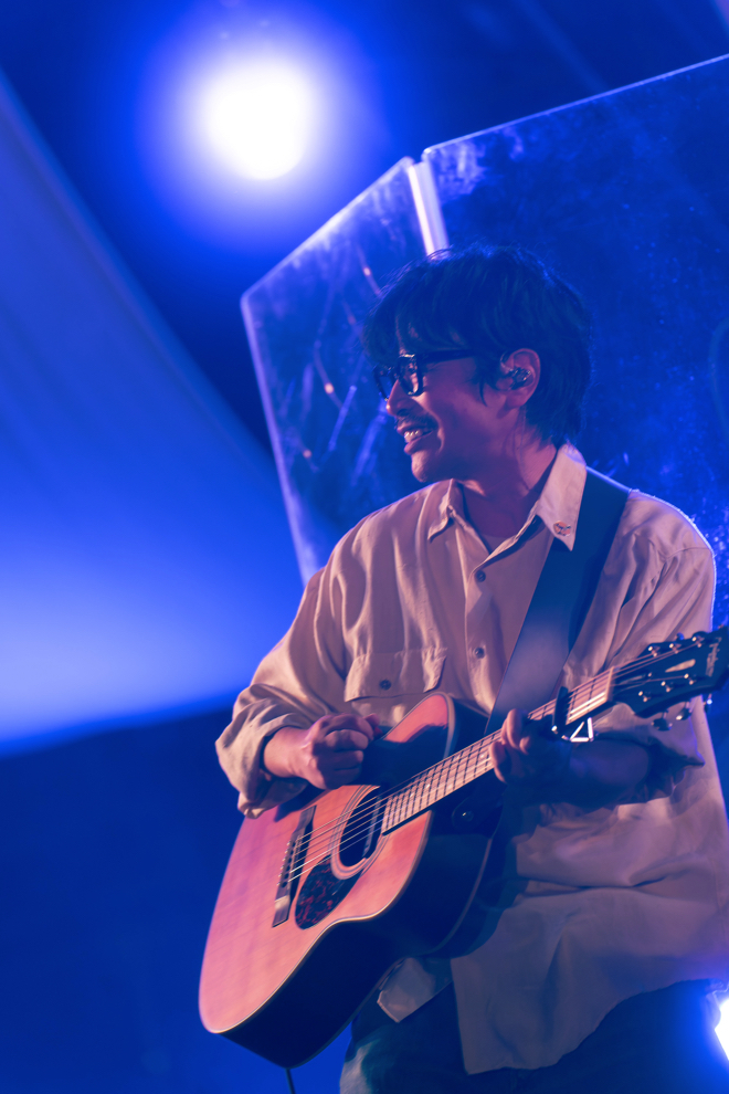 そして、「今年は若いアーティストに出演していただこうというとき、真っ先に名前が挙がって。くるりの遺伝子を引き継ぐところもあり、さっき会ったら何だかキラキラしてました(笑)」と岸田から紹介を受けたトップバッターは、マカロニえんぴつ。冒頭からくるりの「尼崎の魚」を一節カバーしリスペクトを表した後も、「レモンパイ」「洗濯機と君とラヂオ」等ライブ映えするナンバーを連発。MCでは、「ロックにおいて先陣を切って道を切り拓いてくれて、曲を作る上では教科書にもなっている。ずっとリスナーだったので、呼んでいただいたときは感無量でした」と、はっとり(Vo,G)が思いを述べる。後半戦も、岸田がはっとりとの雑誌の対談企画でフェイバリットに挙げた「恋人ごっこ」や、人気曲の「ヤングアダルト」などを惜しみなく披露し、「大好きなくるりがくれた出会いに感謝します。この後はお客さんとして楽しみたいと思います。もっともっと京都に来たいと思いました」と、最後の「なんでもないよ、」までみずみずしいメロディを届け続けた。