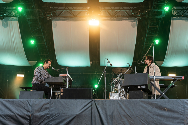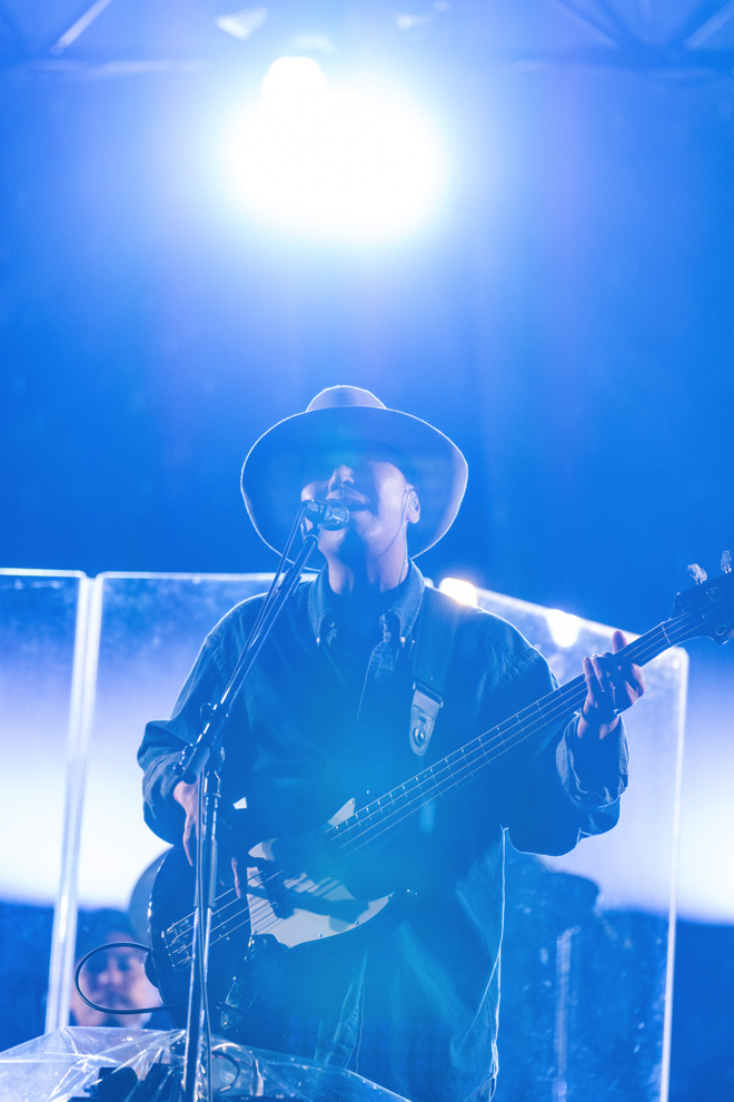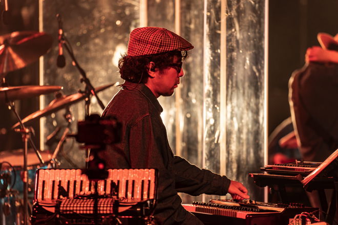 三番手のアントニオ・ロウレイロ&ハファエル・マルチニは、今年唯一の海外アーティスト。10種類近い楽器を演奏するマルチ奏者、シンガー、コンポーザーのアントニオ・ロウレイロは2015年、コンポーザー、シンガー、鍵盤および弦楽器奏者のハファエル・マルチニは2017年の<音博>でも素晴らしい演奏で観客を魅了したが、今回は現代ブラジル/南米音楽をリードする2人による最強タッグに。岸田も「すごい人とすごい人が一緒にやるとすごい音楽になる」と、その出番を前に誰より高揚している様子で、降雨による機材トラブルに見舞われたものの、その雨がライブをよりドラマチックに演出。舞台中央に向かい合う形で鍵盤とドラムセットが設置され、「Universo」ではハファエル、「Me dê a mão」ではアントニオとボーカルをスイッチしつつ、インプロヴィゼーション感のあるスリリングな旋律とビートを創出。静寂と雨音が交差する曲間すら美しい、豊潤でメロウな全6曲の音楽体験となった。